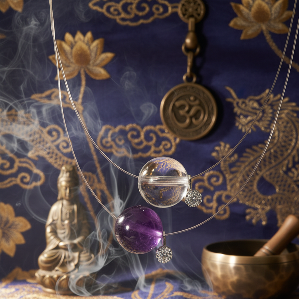 This elegant necklace features natural Amethyst and Clear Quartz gemstones, delicately paired with an S925 sterling silver pendant and an invisible fishing-line design that creates the illusion of a crystal floating gracefully around your neck.